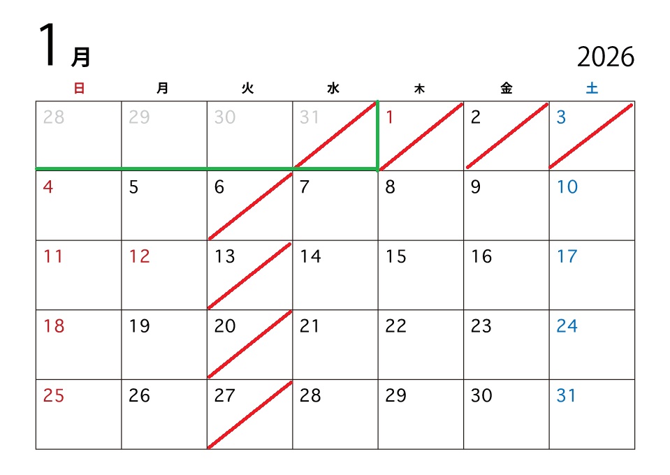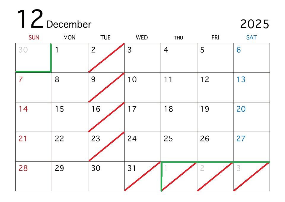 2025年12月1日 月曜日 12月 1月 営業日のご案内 *2025年は30日(火)までの営業となります *火曜日は定休日 となります *4日(日)10:00から営業いたします *12日(祝月)成人式営業の為営業時間が変わります *火曜日は定休日 となります